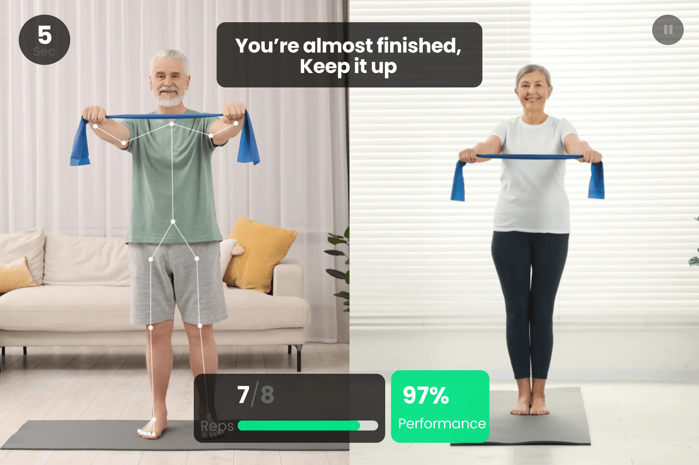 Residents start with a remote consultation, followed by guided physiotherapy or fitness sessions enhanced with real-time feedback and expert oversight and designed to support safe, effective movement and independence.